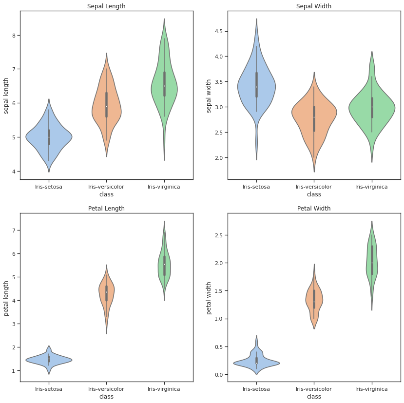 sns.violinplot(x="class", y=val, data=df, ax=axes[ind // 2, ind % 2]).set(