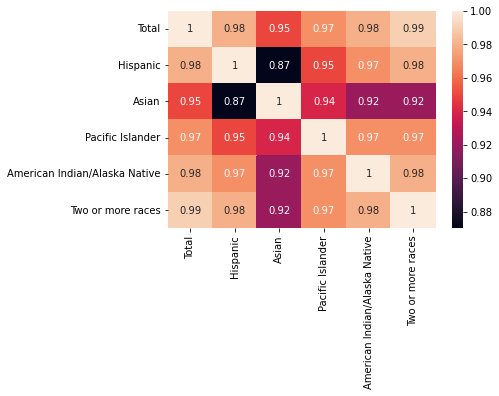 | Two or more races | 157.0 | NaN | NaN | NaN | 44.46 | 31.58 | 2.9 | 25.7 | 34.7 | 87.9 | 98.2 |