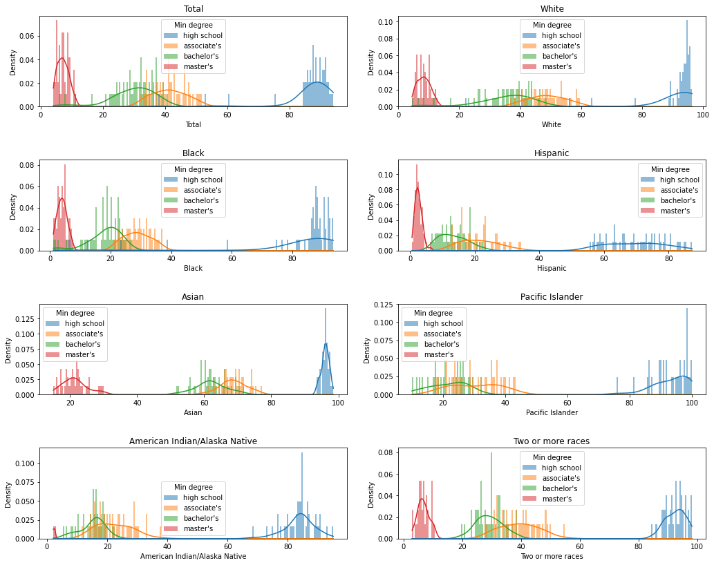 | Year | Sex | Min degree | Total | White | Black | Hispanic | Asian | Pacific Islander | American Indian/Alaska Native | Two or more races | |