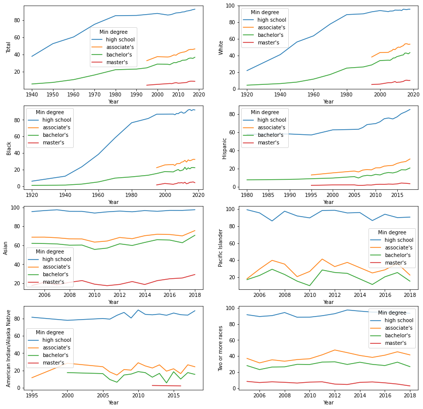 The original dataset is titled: Percentage of persons 25 to 29 years old with selected levels of educational attainment, by race/ethnicity and sex: Selected years, 1920 through 2018. The cleaned version has columns for Year, Sex, Educational Attainment, and race/ethnicity categories considered in the dataset. Note that not all columns will have data starting at 1920.
